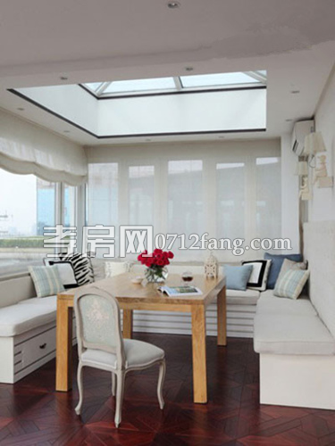 装饰Tips:客厅延伸出来的小阳台,搭上天棚,摆放上休闲沙发椅子,舒适吊椅,淡蓝色白色相间的地板,让整个阳台空间清新有余,更显小资乐活态,窗外和煦的阳光,搭配整体淡雅的装饰,即使再热的夏天,生活也会变的格外清爽简洁。