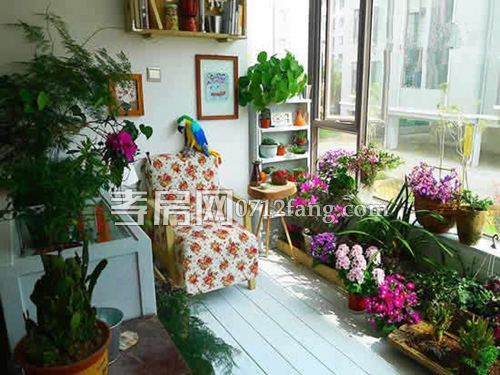 装饰Tips:宽敞明亮的阳台,搭配画案布艺沙发,而且摆满了各种各样的绿植和鲜花,更别的是花盆也很有自然气息,都是木头材质的、手工花盆,让小阳台自然气息浓厚,在此休憩岂不乐哉!