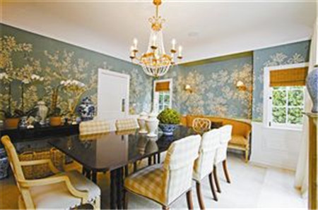 Tips:壁纸拼贴的多种思路。如果房间比较小,可以铺贴横向条纹的壁纸,扩展空间;如果房间比较低,可以选择纵向条纹的图案,使视觉有向上延伸的感觉;如果房间比较大,选择大图案的壁纸,可以凸显恢弘大气;如果房间很高,用分段式拼贴的手法,不会显得单调乏味了。