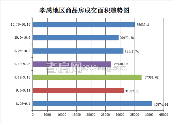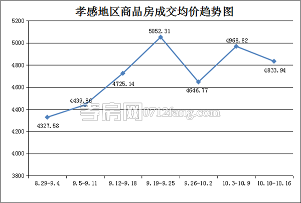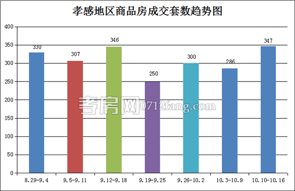 从2016年10月10日到2016年10月16日,孝感地区销售总交易记录347套,环比比上上周(286套)上涨约21.33%;成交均价4833.94元/平方米,环比上上周(4968.82元/平方米)下滑约2.71%;成交面积35039.30平方米,环比上上周(29470.78平方米)上涨约18.89%;成交总金额环比上上周上涨约15.67%。