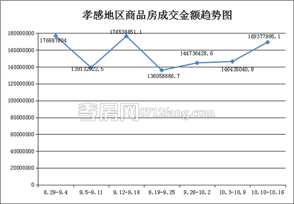 据孝房网数据研究显示,从2016年10月10日到2016年10月16日,孝感地区销售总交易记录347套,面积为35039.30平方米,金额为169377995.09元,均价为4833.94元/平方米。