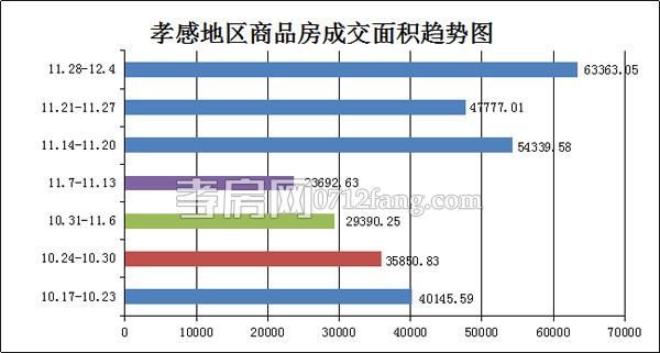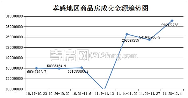 从2016年11月28日到2016年12月4日,孝感地区销售总交易记录516套,环比比上上周(409套)上升约26.16%;成交均价4621.04元/平方米,环比上上周(5057.79元/平方米)下滑约8.64%;成交面积63363.05平方米,环比上上周(47777.01平方米)上升约32.62%;成交总金额环比上上周上升约22.9%。