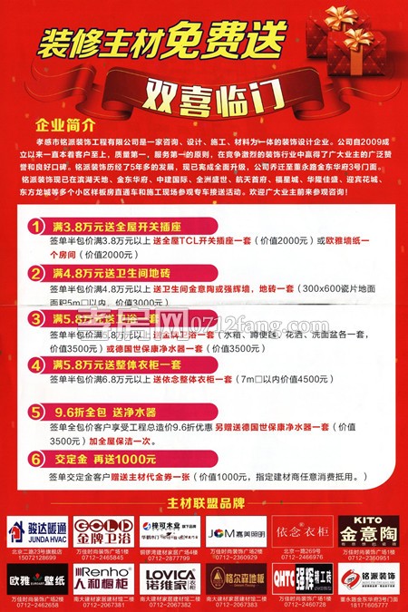 铭派装饰5周年庆典 暨乔迁之喜 主材免费送 2014-09-24 小编: 来源:|0 点击:2312 购房省钱秘笈 你get到了吗? 湖北省孝感市铭派装饰工程有限公司成立于2009年,是一家集装饰设计、工程施工、材料配送、售后服务为一体的专业室内外装饰企业。主要从事住宅、公寓、办公、商业、酒店等场所的装修设计和施工。 公司始终秉承以“诚信、质优、透明、环保”为我们的服务宗旨。坚持走“用心打造,绿色空间”,具有“居者”色的品牌路线。公司崇尚精致设计、精湛工艺、精品服务,努力打造个性化的装饰品牌。 公司电话:18171605777 公司地址:孝感市董永路金东华府3号门面