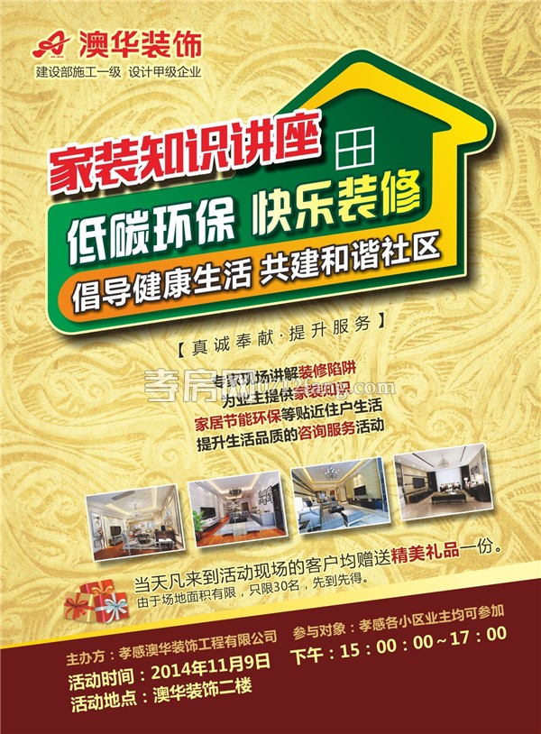 11月9日,澳华装饰携手家装界权威专家,带来公益家装讲座“低碳环保,快乐装修” 装修知识全程讲解,与专家互动,一起打造您舒适的家!!!为了感谢大家对咱们澳华装饰“家装讲座”一如既往的支持,推出优惠活动,回馈孝感的新老客户! (不论您是没有装修计划,还是即将装修,或者是已经选择装修公司正在装修,都希望您看完我们下面的内容,考虑来参加我们的讲座)