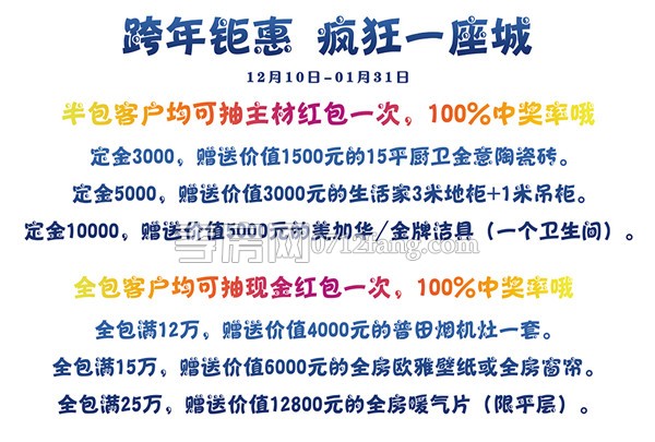 7, 全包专享:全包满25万及以上,赠送全房暖气片(限平层),价值12800元。抽现金红包,中奖。